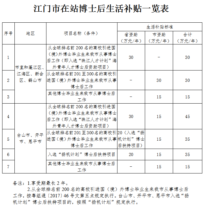 补贴标准按《江门市在站博士后生活补贴一览表》(详见附表)执行,享受期最长2年。