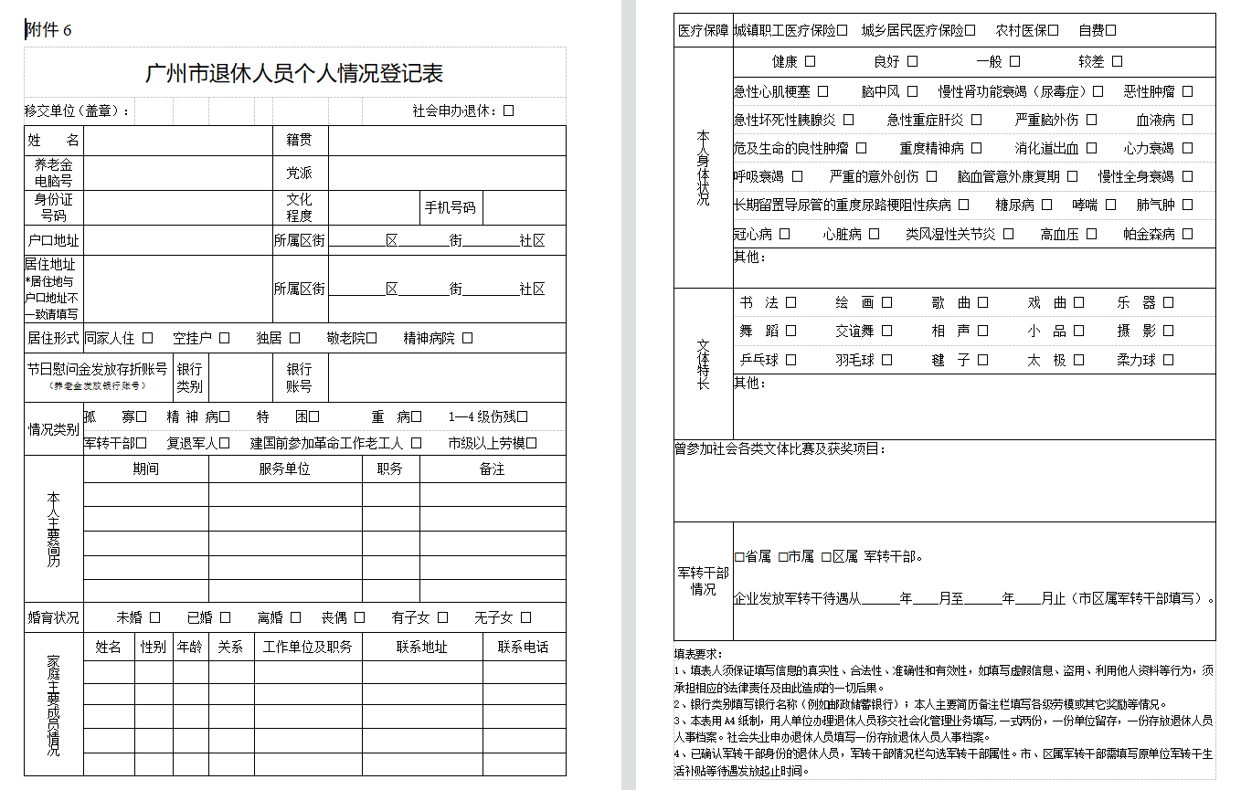 3、本表用A4纸制,用人单位办理退休人员移交社会化管理业务填写,一式两份,一份单位留存,一份存放退休人员人事档案。社会失业申办退休人员填写一份存放退休人员人事档案。