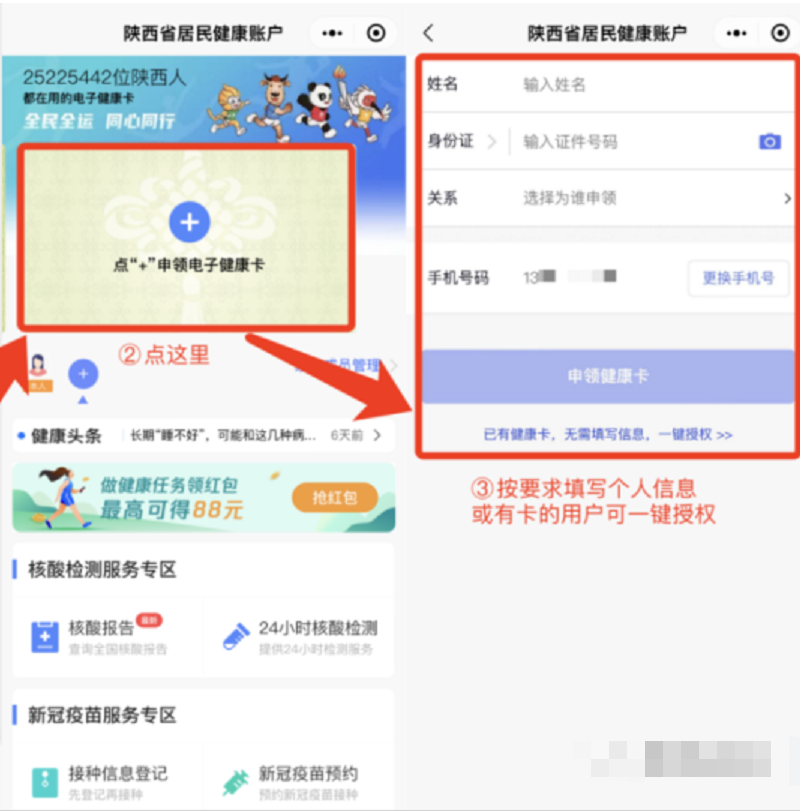 点+申领电子健康卡”→按要求填写个人信息/有卡用户可一键授权→成功申领电子健康卡