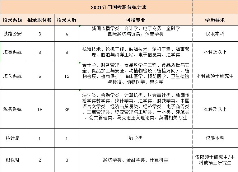 从专业来看:国考江门岗位对专业要求并不严,多专业而且基本都是大类的专业,像税务系统的有20个专业可报考!上面部分专业,教师类考生也是可以报考的!