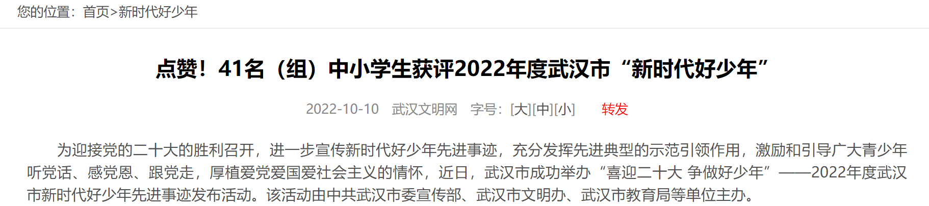 经逐级推选、审核把关、媒体公示等环节,推评丁宥涵等41名(组)同学为2022年度武汉市“新时代好少年”。他们从不同侧面诠释了当代少年向上向善、奋发有为的优良品质,蕴含着榜样力量,充满了时代气息。