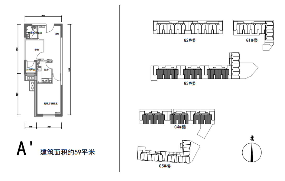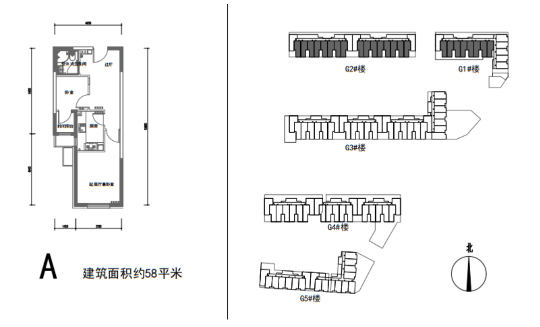 户型面积:大套型:57.60㎡-59.14㎡(二居室)