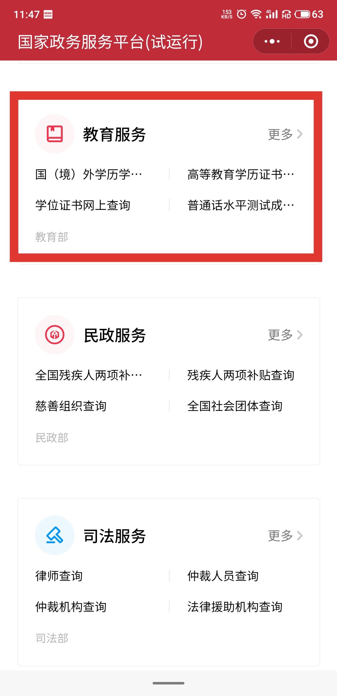 第一步:进入百度,搜索国家政务服务平台小程序,进入小程序,找到教育服务,点击『更多』