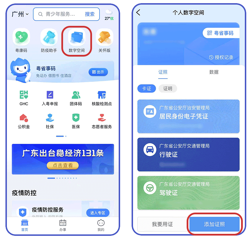 方式一:进入粤省事APP,点击“数字空间”-“添加证照”-“居住证”,根据页面提示完成关联。