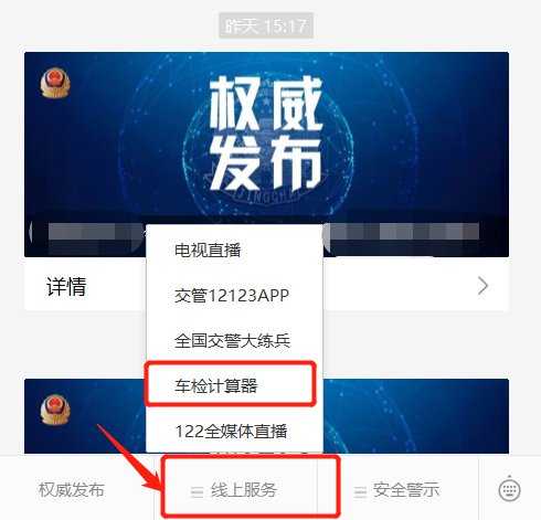 2、可关注“公安部交通管理局”官方微信公众号,在底部菜单栏点击:“在线服务”—“车检计算器”,计算车辆是否需要检验。