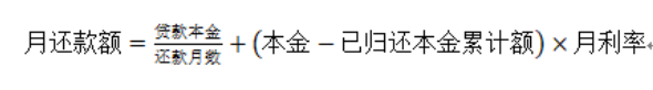 2、按月等额本金还款法:借款人每月偿还的本金固定不变,贷款利息逐月递减的还款方式。