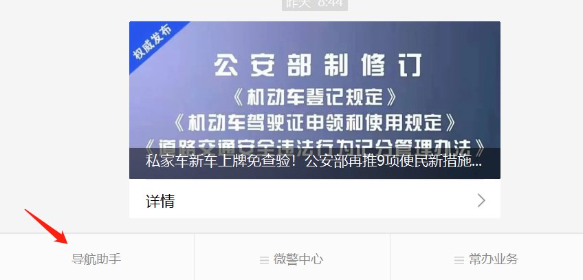 第一步:进入江门公安邑微警公众号平台,点击“导航助手”进入江门公安邑微警主界面。