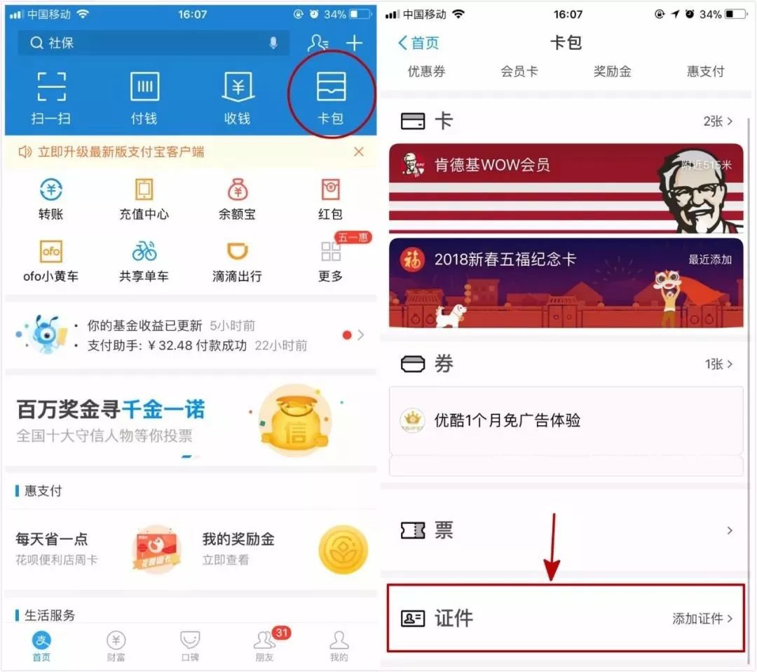 第一步:打开支付宝,点击右上角“卡包”,将页面拉到最底下,点击“证件”,跳到新页面后,点击“身份证网证”;