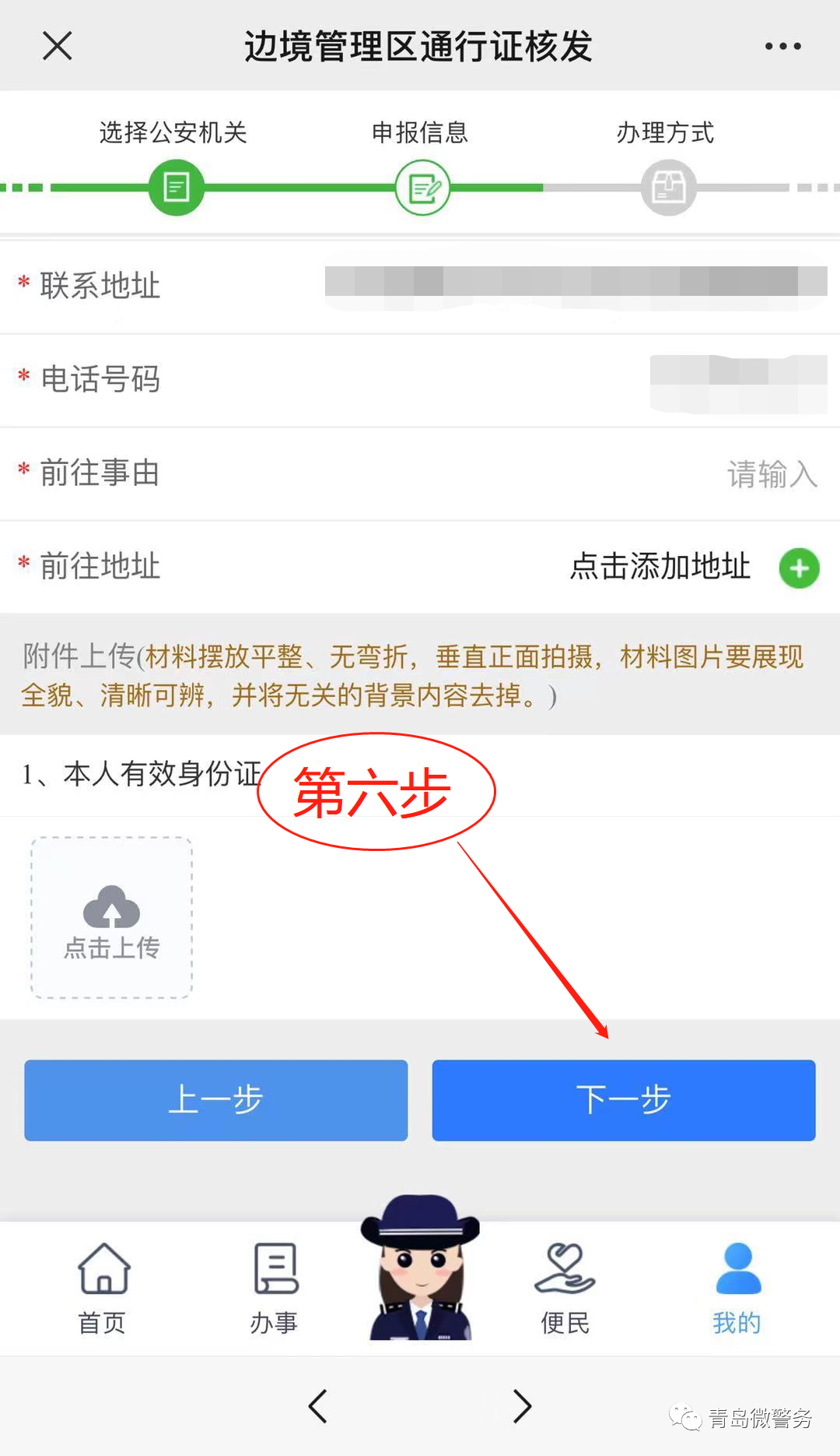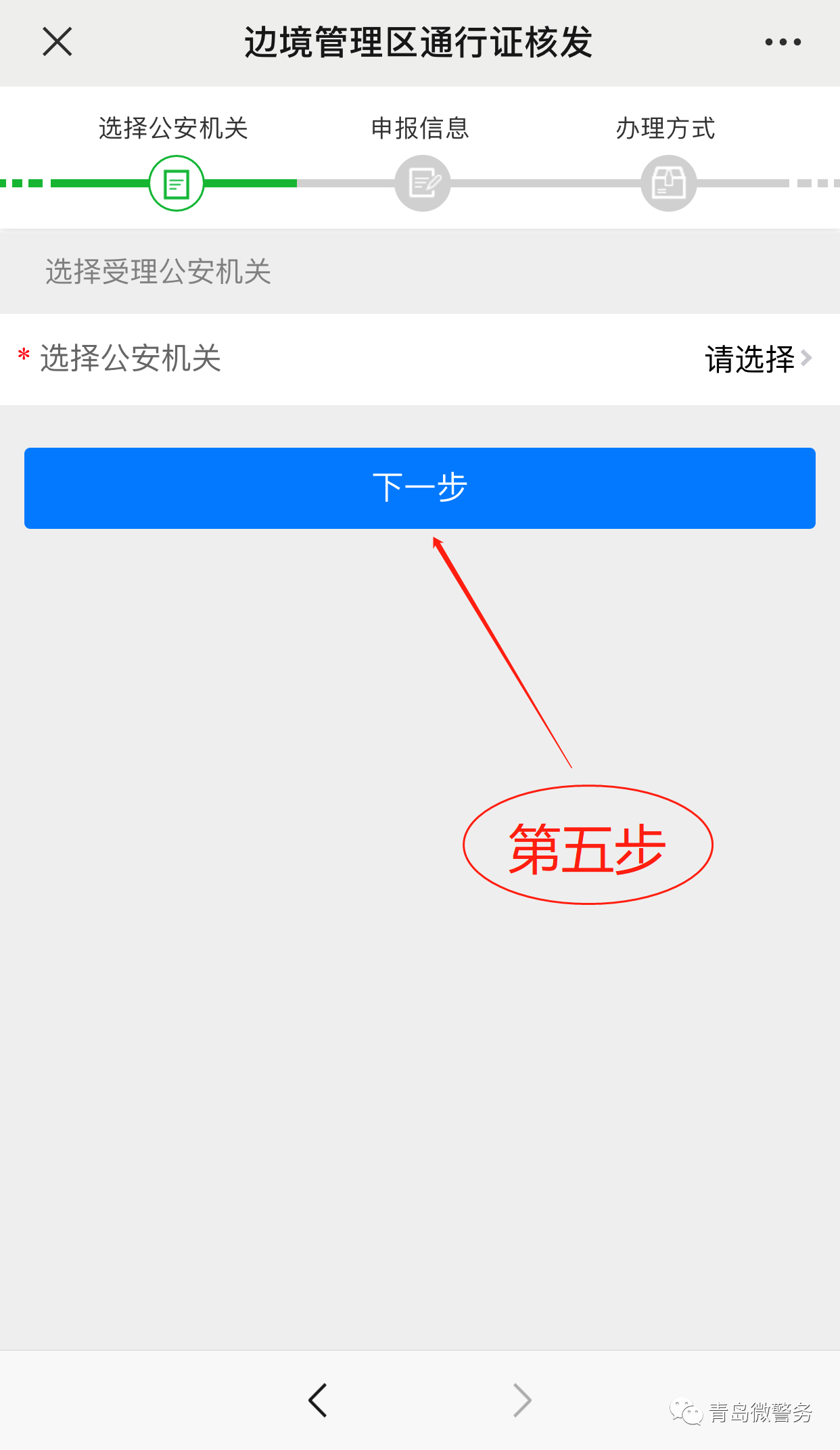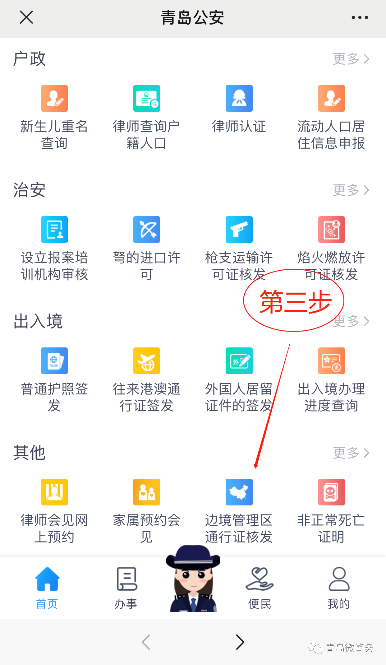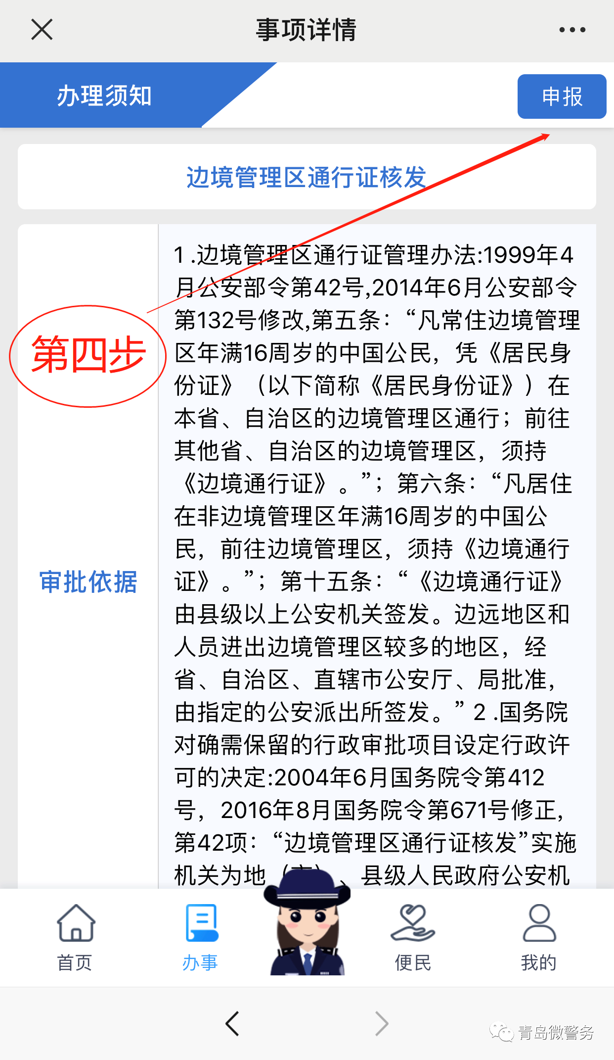 网办流程:进入“青岛微警务”——点击“微警务”(直接点击上方入口进入)——登陆后选择“边境管理区通行证核发”——进入之后选择“申报”,填写相关信息。