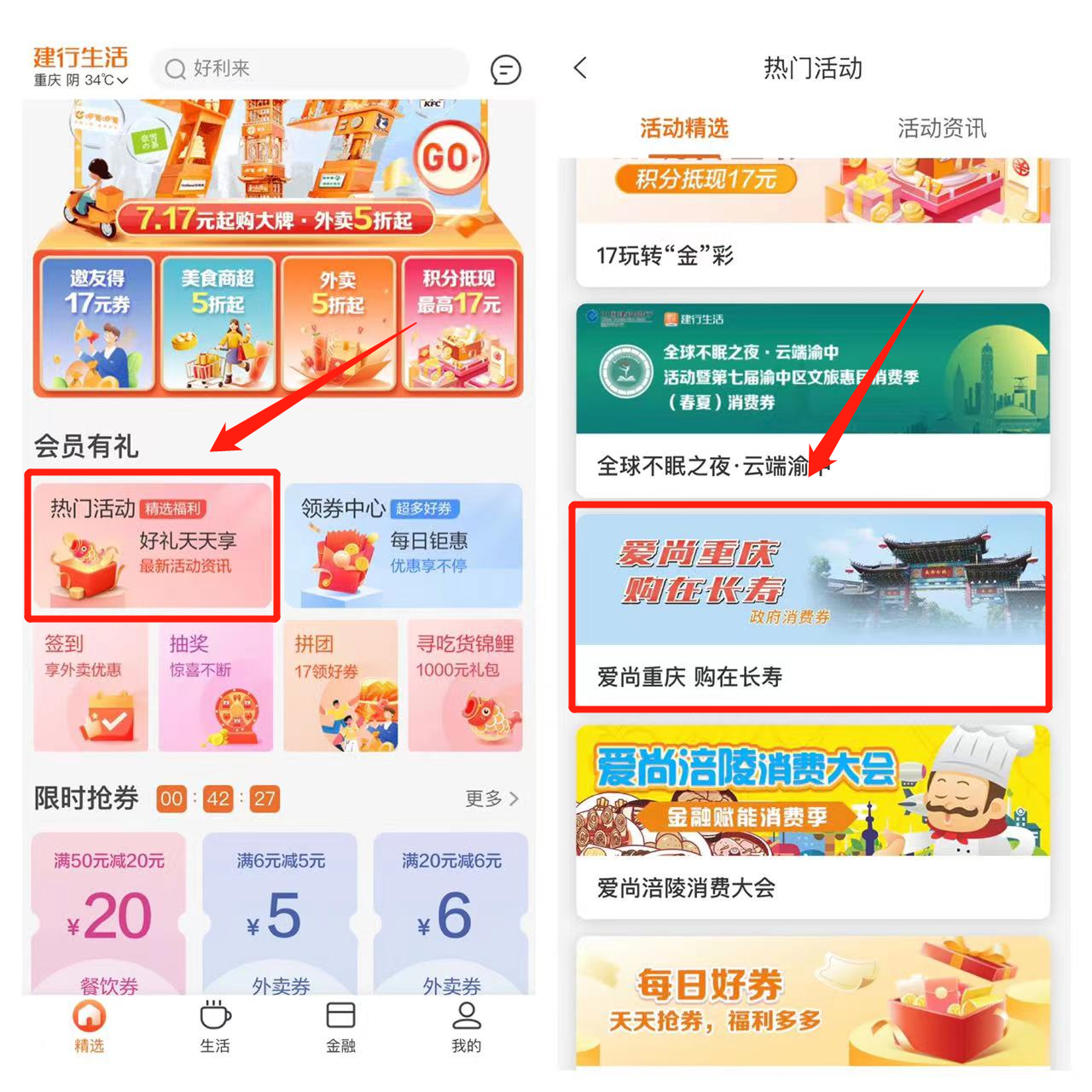 第一步:进入“建行生活”APP,在主页面找到“热门活动”,进入后在[活动精选]栏目,下拉找到“爱尚重庆 购在长寿”。