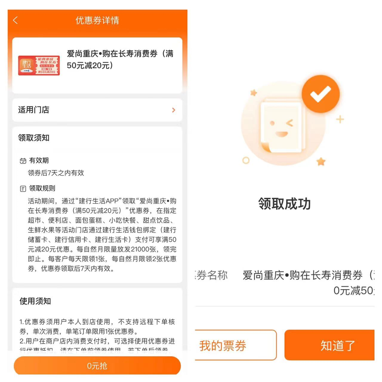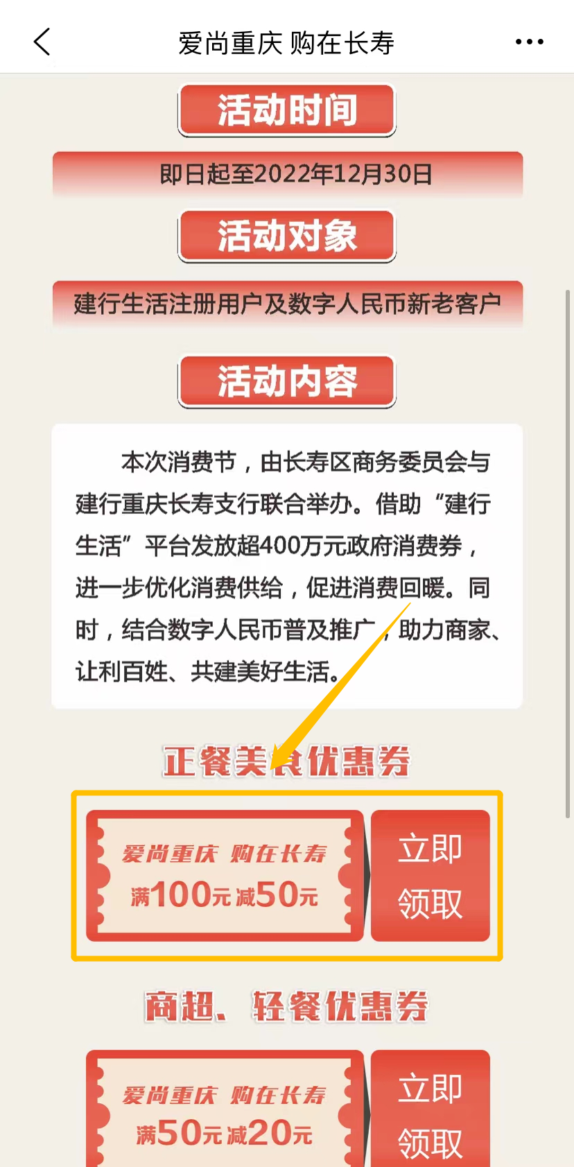 下载“建行生活”APP并完成用户注册→打开“建行生活”APP在主页面找到“热门活动”→进入“活动精选”页面,找到“爱尚重庆 购在长寿”,点击进入领取。