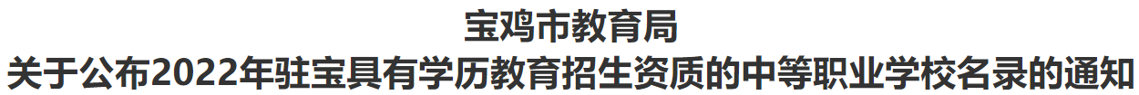 为切实加强中等职业学校招生管理,规范招生行为,按照陕西省教育厅《关于公布2022年陕西省具有学历教育招生资质的中等职业学校名录的通知》(陕教函[2022]628号)要求,现将2022年驻宝具有学历教育招生资质的中等职业学校名录(见附件)予以公布。