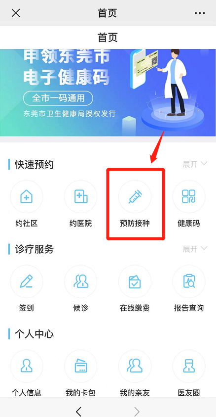 进入健康东莞APP后,点击【立即绑定】—【预防接种】
