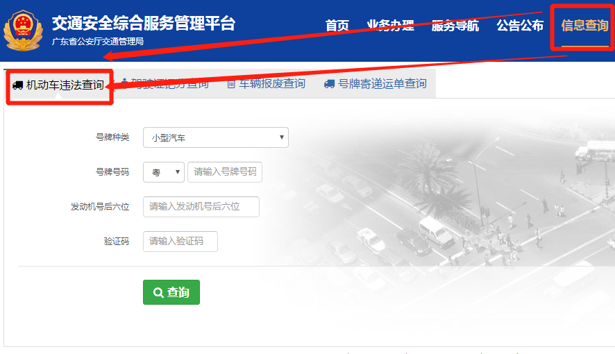 第二步:输入车辆的信息(车牌号码、发动机号,选择汽车种类),然后根据系统提示完成查询