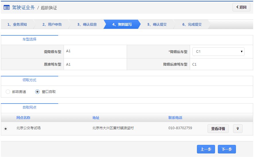 在该步骤,用户需认真确认降级后准驾车型,并且选择领取方式是邮政寄递或窗口自取。业务成功受理后,如果选择邮政寄递的,邮政人员将上门收取相关资料和费用,交付机动车驾驶证及收费票据,同时将收回的资料送回车管所。如果选择窗口自取的,则自行到选择的自取网点窗口领取机动车驾驶证。