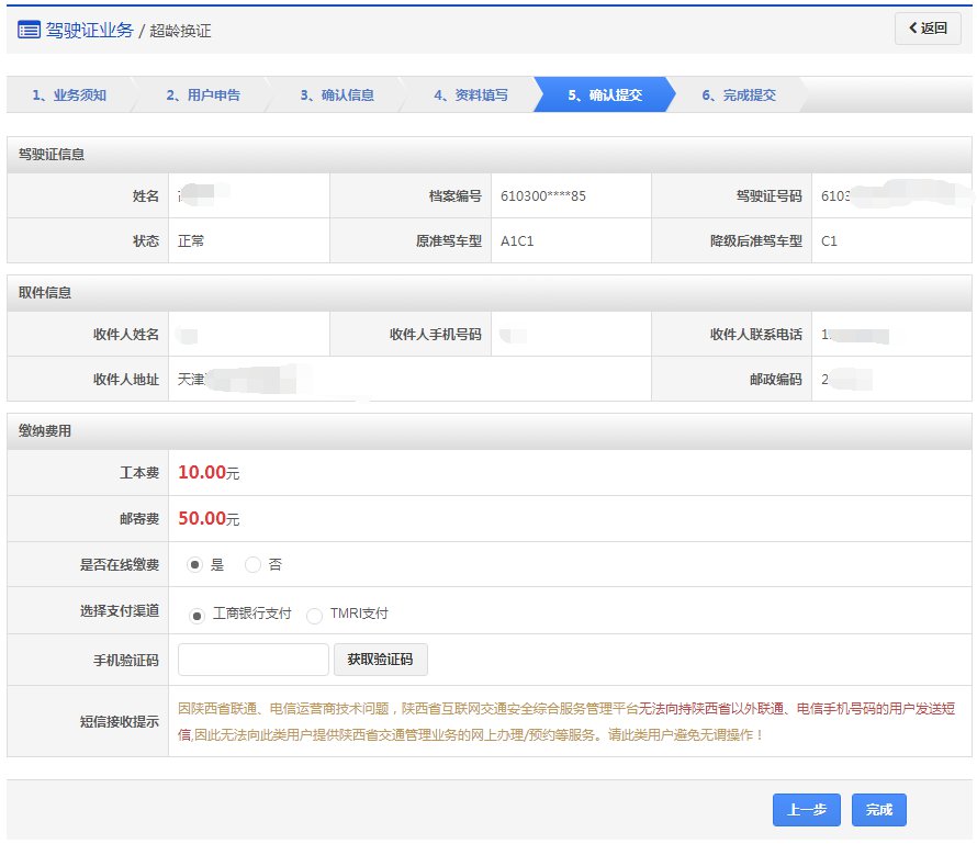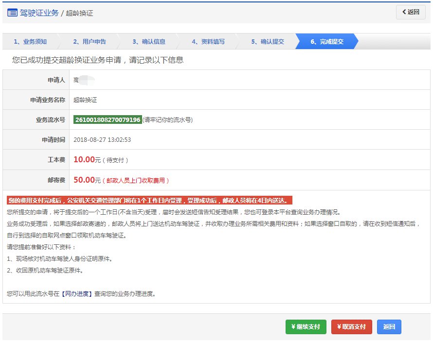 该步骤显示用户的驾驶证信息、领取详情以及需要缴纳费用信息,如果平台已开通在线支付功能,显示在线支付详情。