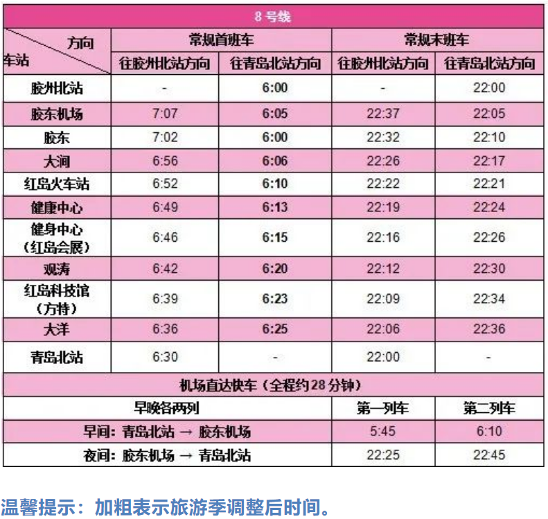 3.根据往年旅游季客流规律及近期客流变化,7月1日至10月8日期间,青岛地铁采取季节性延时,在延续往年延后末班车的基础上,首次提前首班车时间,届时单线路运营时间最大延长30分钟,线网运营服务时间将达18.07小时。