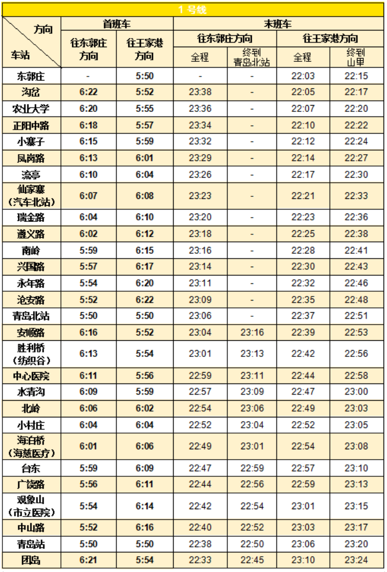 2022青岛地铁1号线夏季首末班时刻表 青岛地铁1号线时间表早晚
