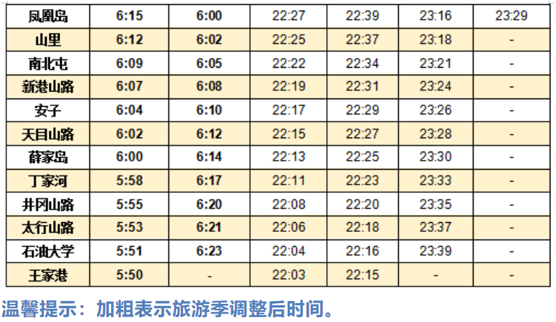 1.本次运营时间调整,各站首班车提前/末班车延后时间不一致,具体可查看详细首末班车时刻表。夜间搭乘地铁的乘客,为避免错过末班车,请合理安排乘车时间,如需换乘,请提前了解换乘线路的末班车时间。