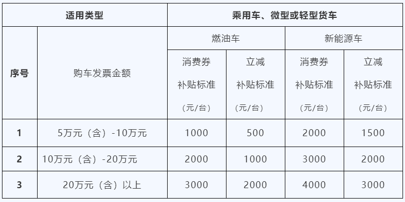 按购车发票金额分为三档,每档可在消费券(百货、汽车内饰、汽车保养)和立减补贴之间二选一,新能源车辆在此基础上每档多增加1000元消费券或立减补贴,具体标准如下。