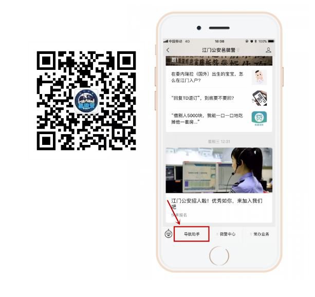 第一步:扫描二维码,关注江门公安邑微警微信公众号,点击“导航助手”进入邑微警主界面。