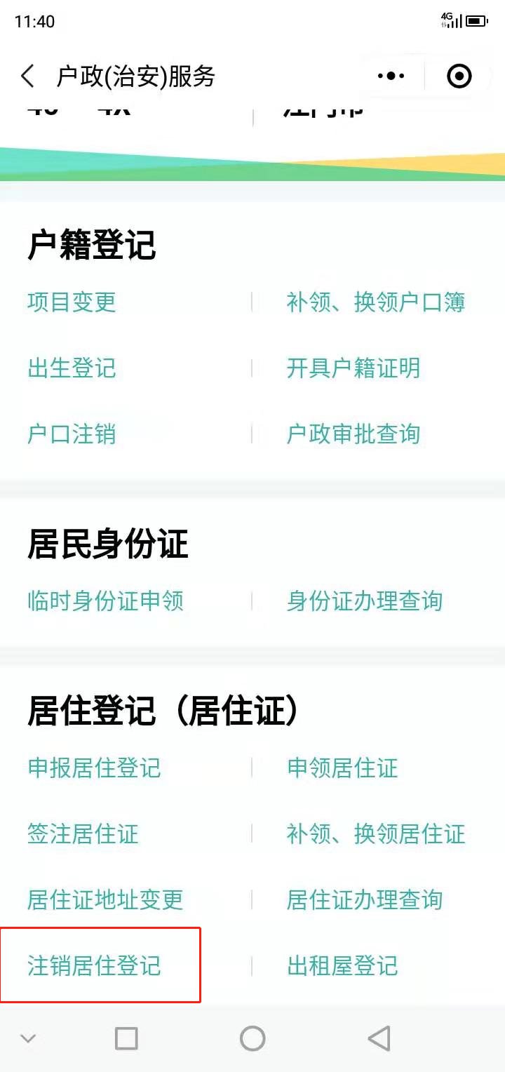 第二步:选择户政(治安)服务菜单,在居住登记(居住证),选择注销居住登记