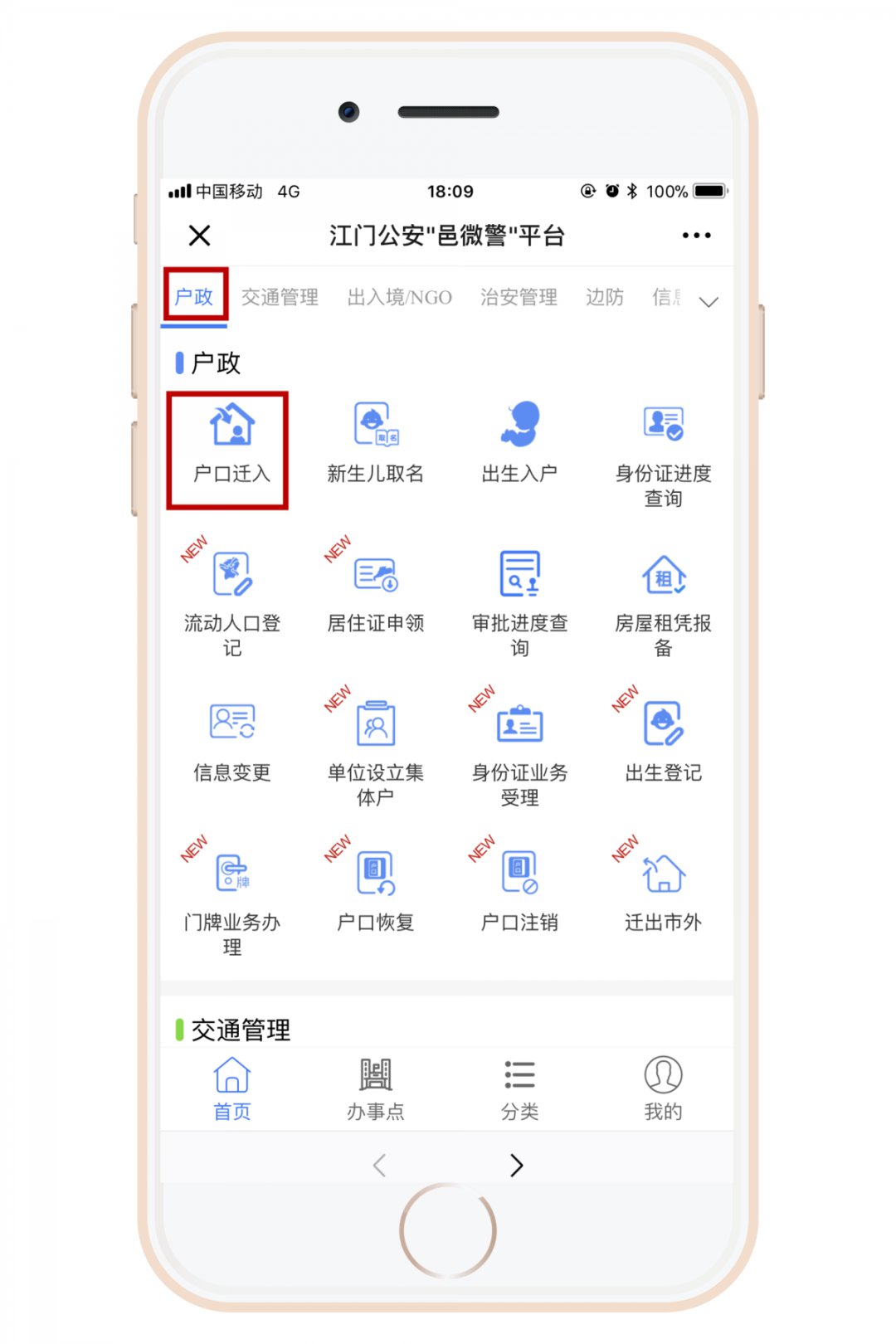 第二步:点选“户政”栏目下的“户口迁入”菜单