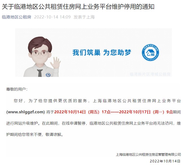 10月14日-17日临港公租房网上业务平台维护停用通知
