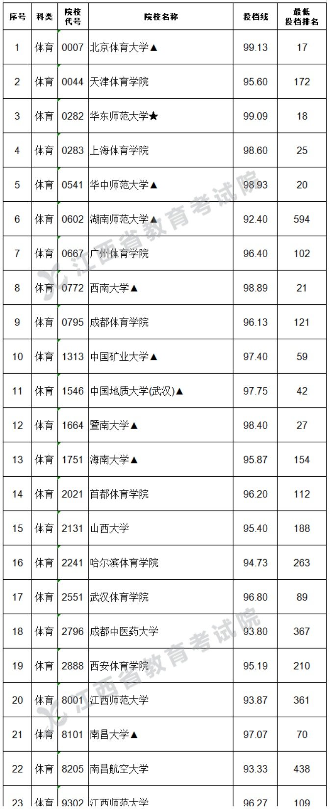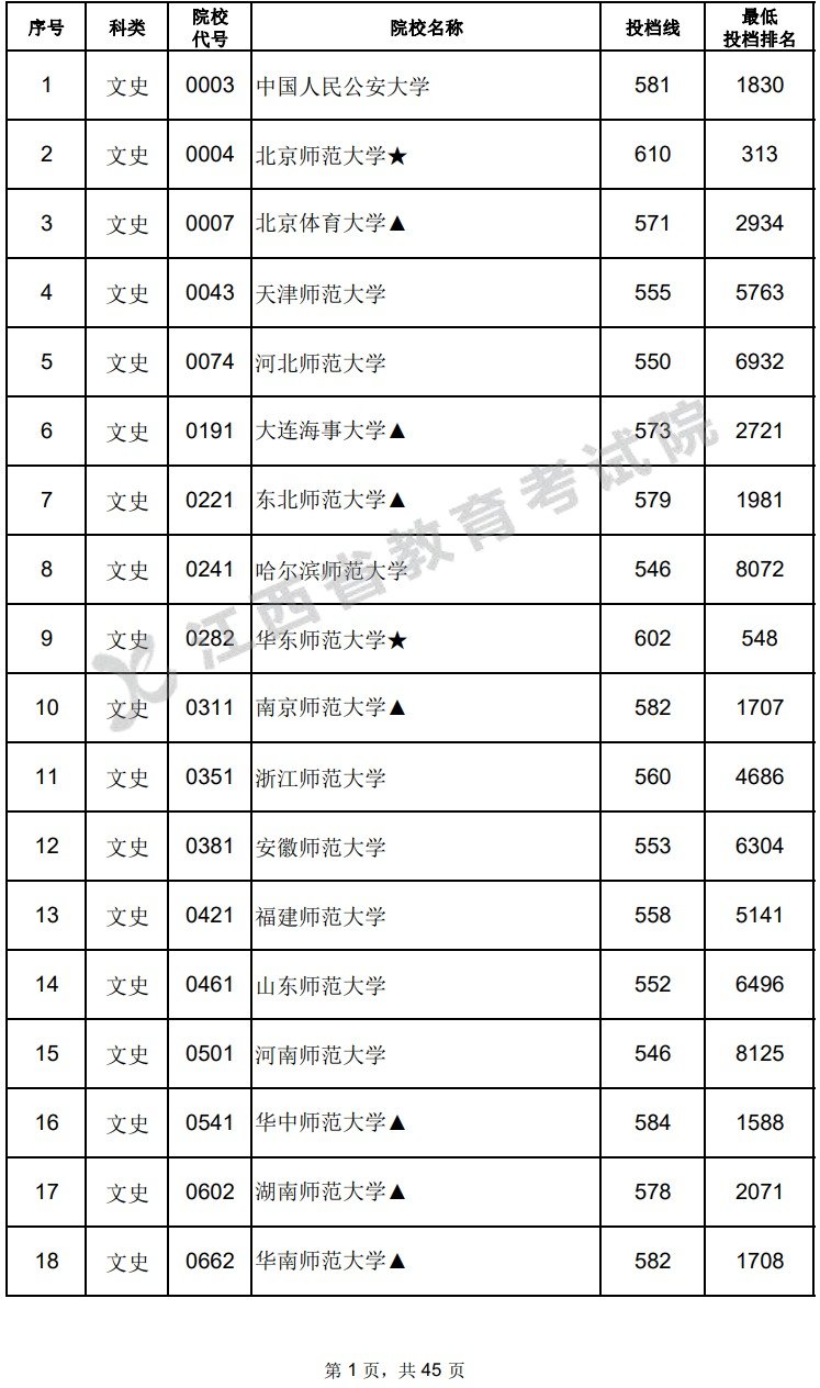 ➤江西省2022年普通高校招生第一批本科投档情况统计表: