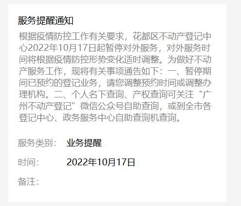 根据疫情防控工作有关要求,花都区不动产登记中心2022年10月17日起暂停对外服务,对外服务时间将根据疫情防控形势变化适时调整。
