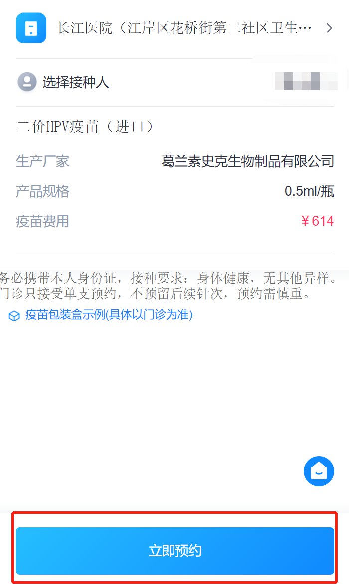 如有苗,则可点击【立即预约】,选择接种人和接种时间后即可跟随引导提交预约。