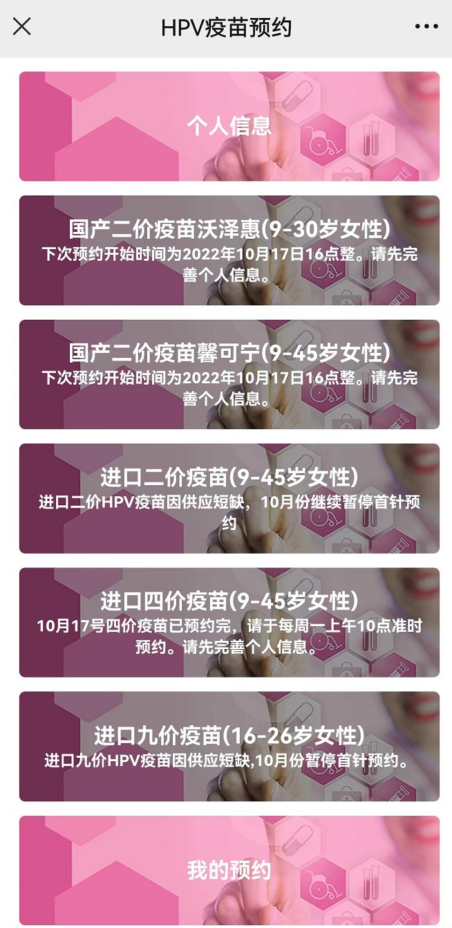 2、填写个人信息并保存。在有疫苗供应时,相应的HPV疫苗预约通道开放后,即可在规定时间段内进行预约。