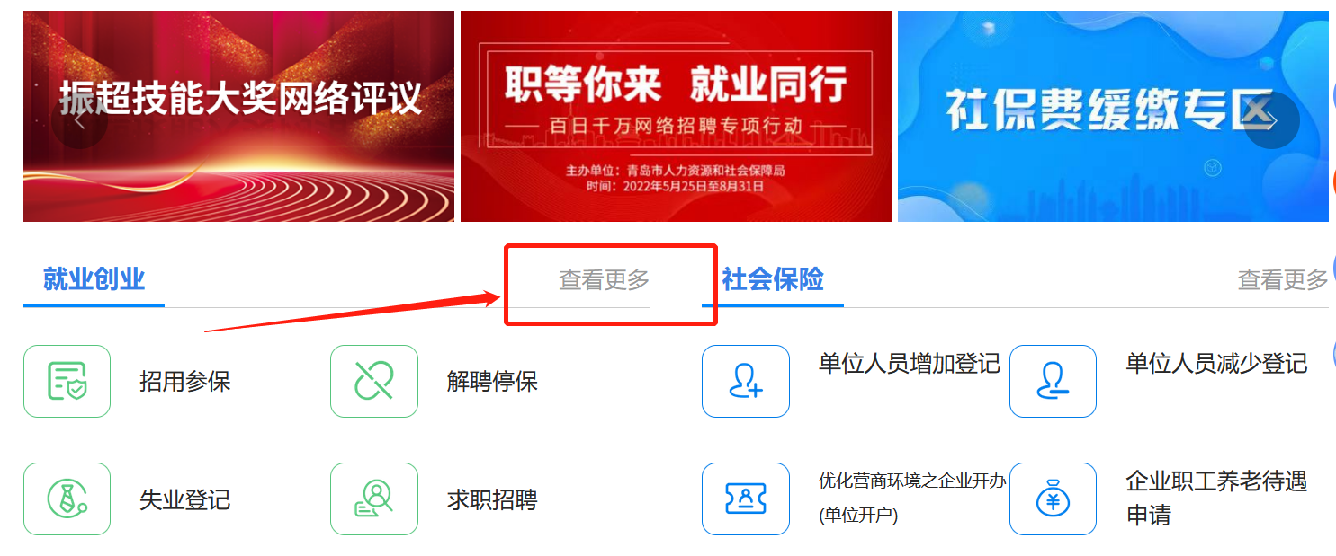 1、进入青岛市人力资源和社会保障局官网:点此进入,选择“就业创业”板块的“查看更多”。