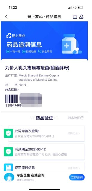 除了查询接种记录之后,不放心的话,还可以查询自己的疫苗批号。如果能拿到疫苗外盒,就可以用支付宝/淘宝APP的扫一扫功能,即可查询到疫苗信息,盒子上有个条码,叫药品追溯码。利用支付宝/淘宝APP即可到扫描查询。