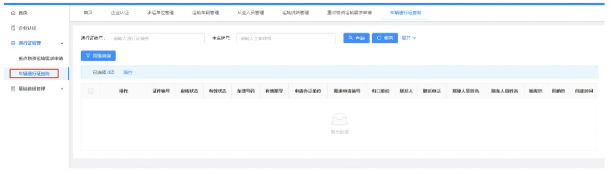 1、通行证申请完成后进入“北京市智慧货运综合服务平台”,登陆后点击菜单【车辆通行证查询】;