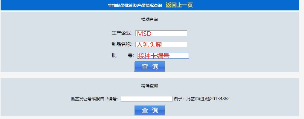 可以在中国药监生物制品批签发管理系统查询,查询时生产企业要输入英文大写字母【MSD】;制品名称输入【人乳头瘤】,批号就是输入你接种卡上的批号。