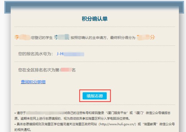 请家长用自己的注册账号和密码登录“i厦门”一站式综合服务平台或“i厦门”微信公众号积分入学栏目查询自己的积分全区排名位次。