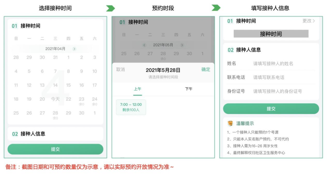 1.预约成功后,无须电话咨询,预约日期即为实际接种日期,不可更改,若出现预约日期无法前来接种的情况,名额自动作废并且不可转让!