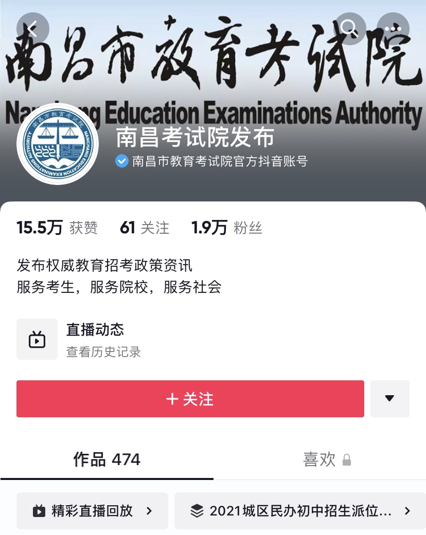 直播开启后,抖音搜索“南昌考试院发布”即可进入直播间(直播结束后,通过“精彩直播回放”入口可以观看直播回放)。
