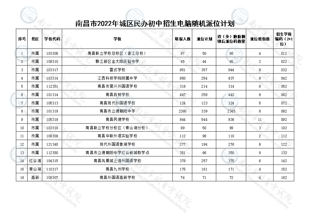 一、南昌市2022年城区(含南昌县)民办初中招生电脑随机派位学校及派位顺序号: