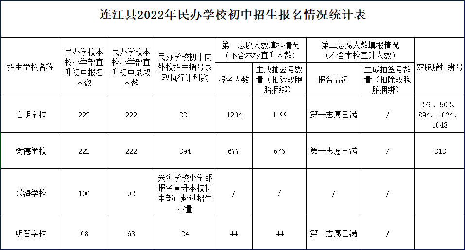 根据连江县教育局《关于做好2022年义务教育招生工作的通知》[连教综(2022)150号]要求,现将连江县2022年民办学校初中招生报名情况公示如下: