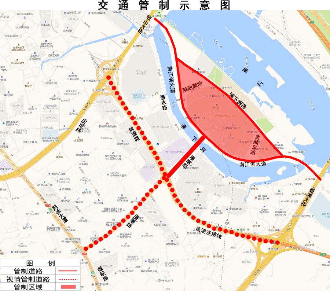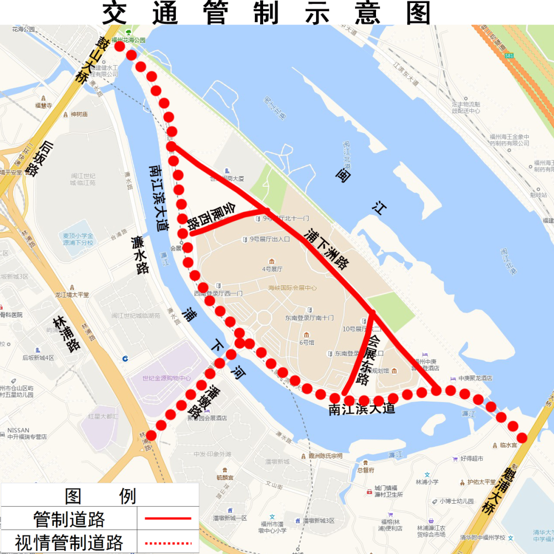 2022年7月23日15:00至19:00和2022年7月22日、7月24日至26日每日7:00至18:00,对浦下洲路、会展东路、会展西路实行交通管制,禁止车辆(除持专用通行证车辆、公交车、出租车外)通行,南江滨大道(东起魁浦大桥桥下西侧路段西至鼓山大桥下)禁止所有车辆(含公交车和出租车)停靠。