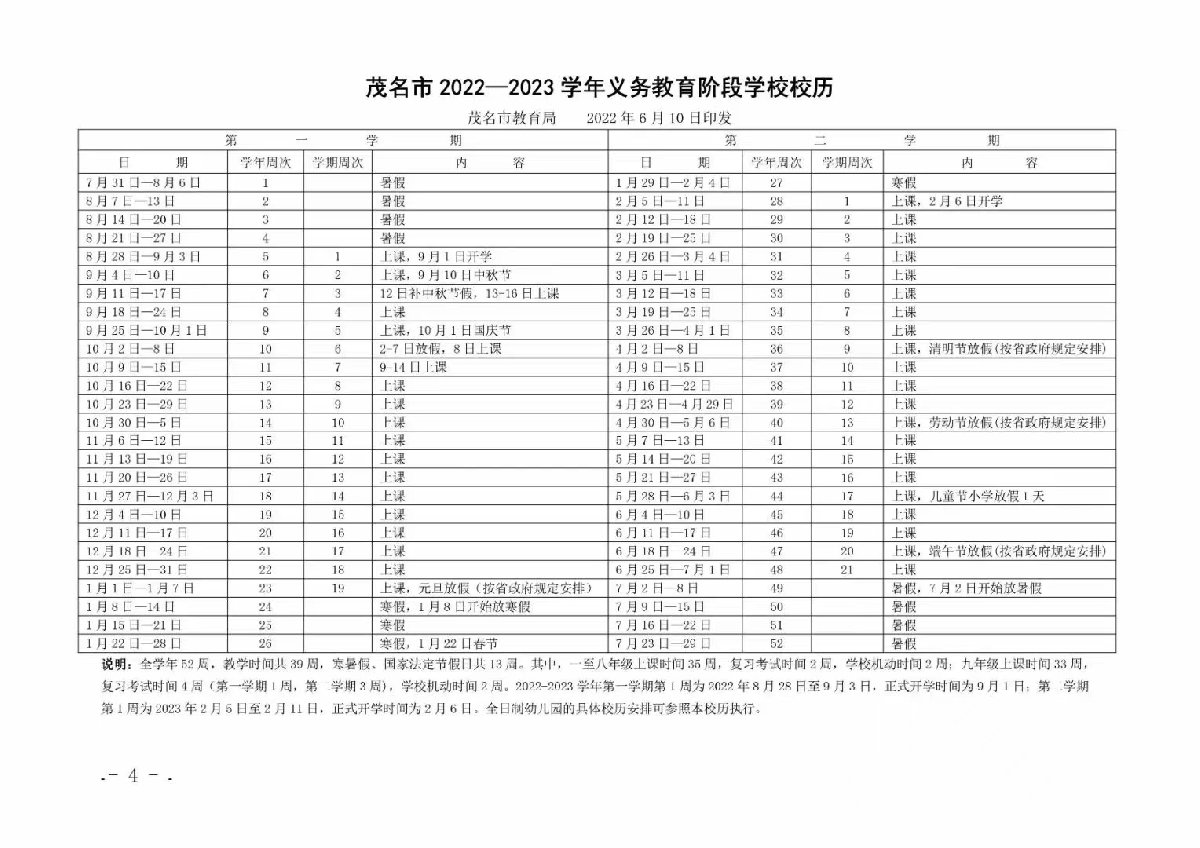 根据茂名市教育局公布的2022-2023学年茂名市义务教育学校校历,茂名市义务教育寒假时间为2023年1月8日-2月5日。
