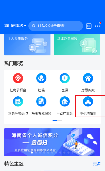 1、打开海易办app,在首页功能区第二行找到【中小幼招生】点击进入;
