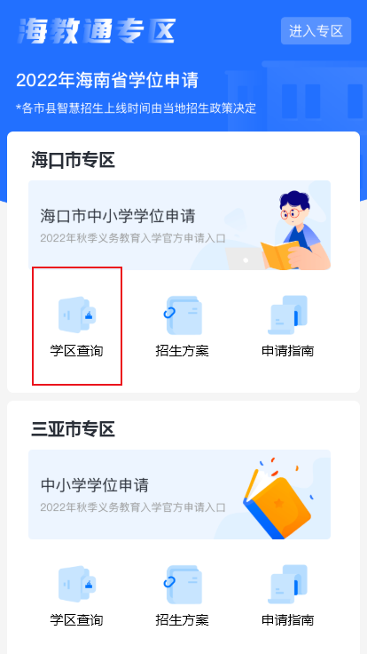 2、找到海口市专区,点击【学区查询】,可以查看2022年海口市中小学校划片招生范围情况。