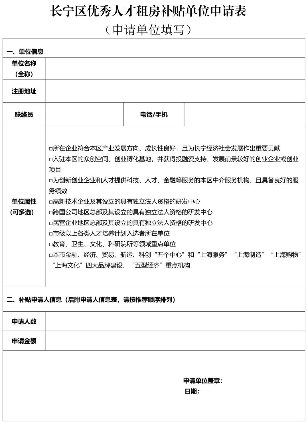 1、《长宁区优秀人才租房补贴单位申请表》: