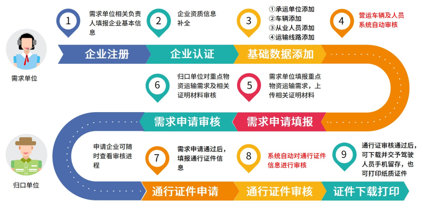 申请单位应在车辆出发或到达24小时前进行申报。重点物资承运车辆年审须在有效期内,危险货物道路运输车辆、总质量12吨及以上普通货运车辆卫星定位系统正常;重点物资承运驾驶人员从业资格证在有效期内,且和驾驶车辆经营范围相符(驾驶总质量4.5吨以下普通货运车辆除外)。