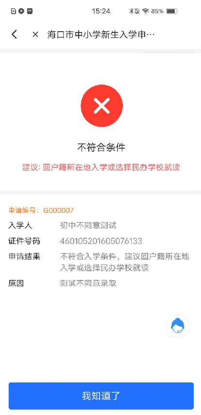②若学校认为不符合入学申请要求,则会展示结果:不符合条件。