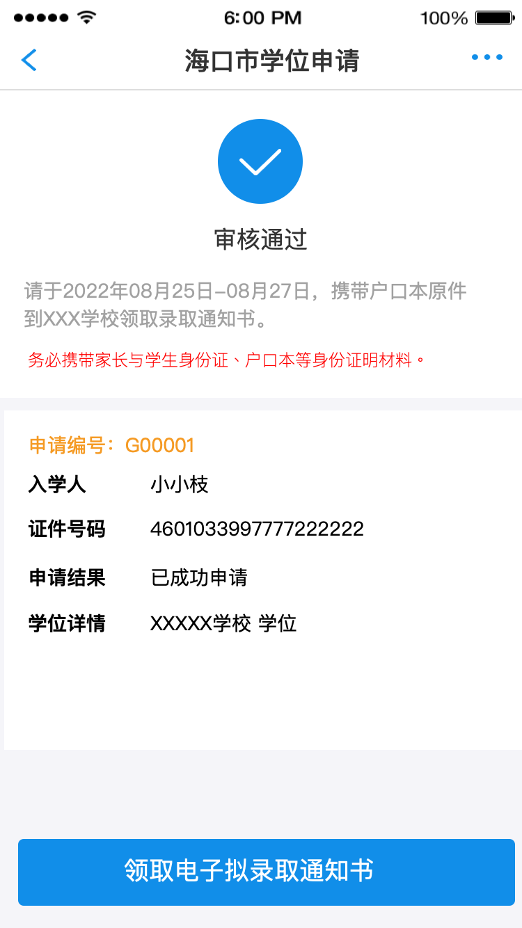 ①审核通过,则可根据页面上内容,携带相关证件到学校领取录取通知书,同时也可直接领取电子录取通知书。
