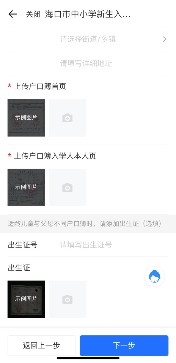 ③选择具体的户籍辖区、街道/乡镇、并填写详细地址,上传户口簿首页、户口簿入学人本人页。